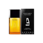 بطری عطر آزارو پور هوم با طراحی مستطیلی، شیشه شفاف و مایع کهربایی رنگ، حس مردانگی، قدرت و کلاس را به تصویر میکشد. درپوش مشکی و لوگوی برجسته Azzaro، سادگی و تجمل را یکجا نشان میدهند.پ