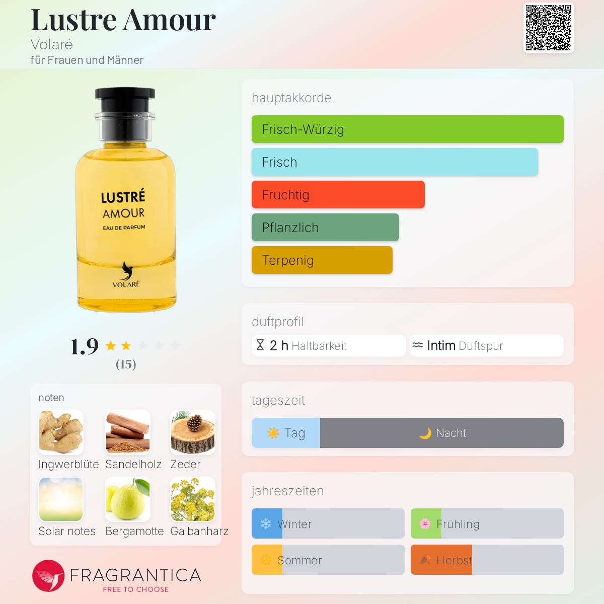 لوستر آمور ولار عطری رمانتیک، لطیف و ماندگار است که با الهام از حس عشق و صمیمیت طراحی شده است. این عطر، انتخابی ایدهآل برای افرادی است که به دنبال رایحهای گرم، دلنشین و احساسی هستند که در عین ظرافت، قدرت اثرگذاری بالایی داشته باشد.