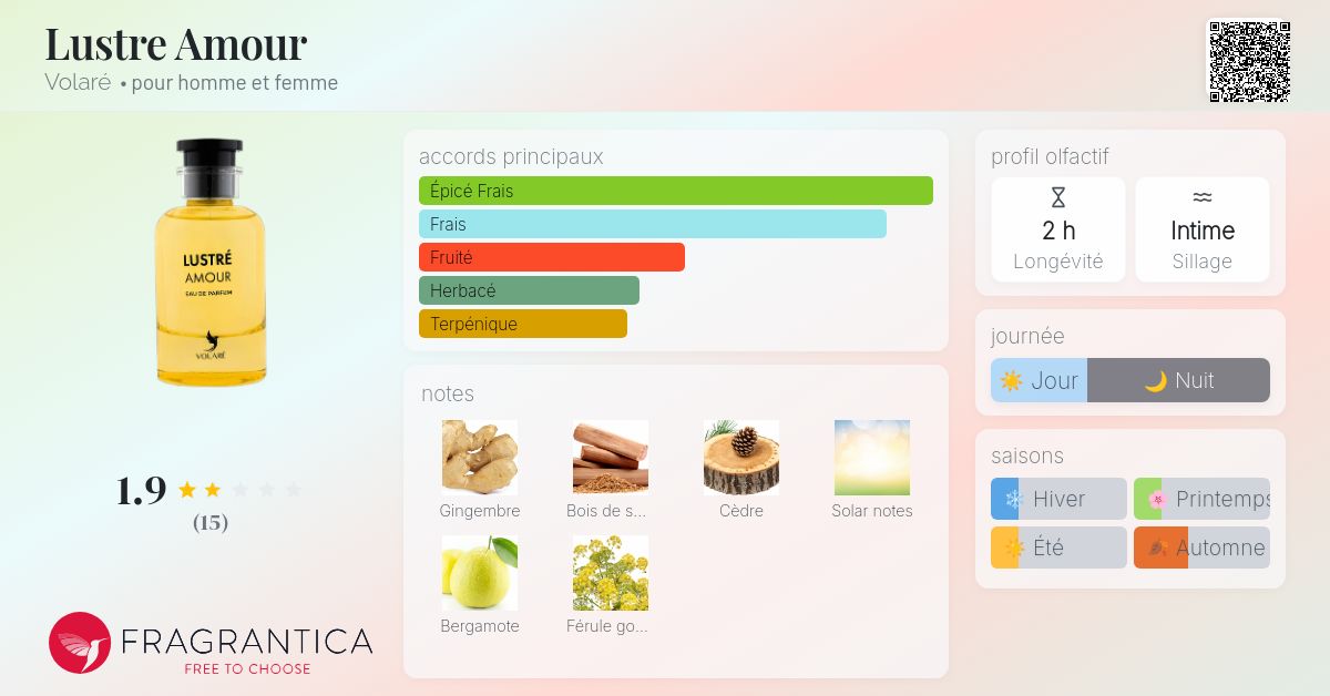 لوستر آمور ولار با پخش بوی متوسط رو به بالا و ماندگاری طولانی (8-10 ساعت)، گزینهای عالی برای قرارهای عاشقانه، مهمانیهای شبانه یا حتی جلسات کاری در فصول سرد و معتدل سال است. در عین گرمی و شیرینی، رایحه آن سنگین و خستهکننده نیست و به راحتی در طول روز نیز قابل استفاده است.