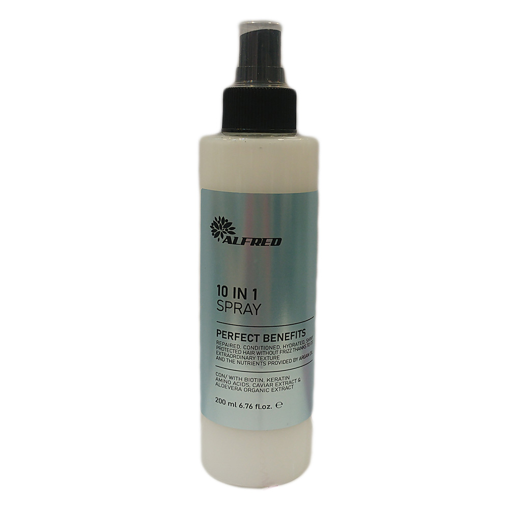 اسپری نرم کننده مو آلفرد 10in1 محصولی آبرسان، تقویت کننده، ترمیم کننده، حجم دهنده، نرم کننده، محافظت کننده و خوشبو کننده مو است. این اسپری مناسب موهای خشک، معمولی، آسیب دیده، نازک و کمحجم و رنگ شده است.با استفاده از این اسپری میتوانید موهای خود را به صورت روزانه و در هر لحظه تغذیه کنید. برای مثال، موهایی را که توسط آفتاب، رنگ کردن، شوره، سشوار و اتو تحت فشار قرار گرفتهاند، احیا کنید.همچنین، این اسپری بوی خوشایندی به مو میبخشد و حاوی روغن آرگان است که ۴ اثر بر موی شما میگذارد. عبارتند از: عطر فوقالعاده، ضد وز، درخشندگی و تغذیه کنندگی. این اسپری تأثیر ضد وز متفاوتی دارد و جلوه رنگ مو را افزایش میدهد. همچنین، کدر بودن رنگ مو را از بین میبرد و آن را براق میکند. این اسپری برای انواع مو قابل استفاده است.
