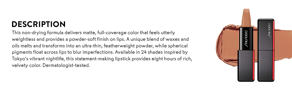بافت کرمی، نرم و سبک رژ لب مات شیسیدو 503 به‌ گونه‌ای طراحی شده است که بدون ایجاد حس سنگینی، چرب شدن، خشکی، پوسته پوسته شدن و چسبندگی روی لب‌ قرار می‌گیرد. لایه رنگ بسیار نازک اما پررنگ، به مصرف‌کننده امکان می‌دهد چندین ساعت بدون نیاز به تمدید از جلوه لب‌ها لذت ببرد.