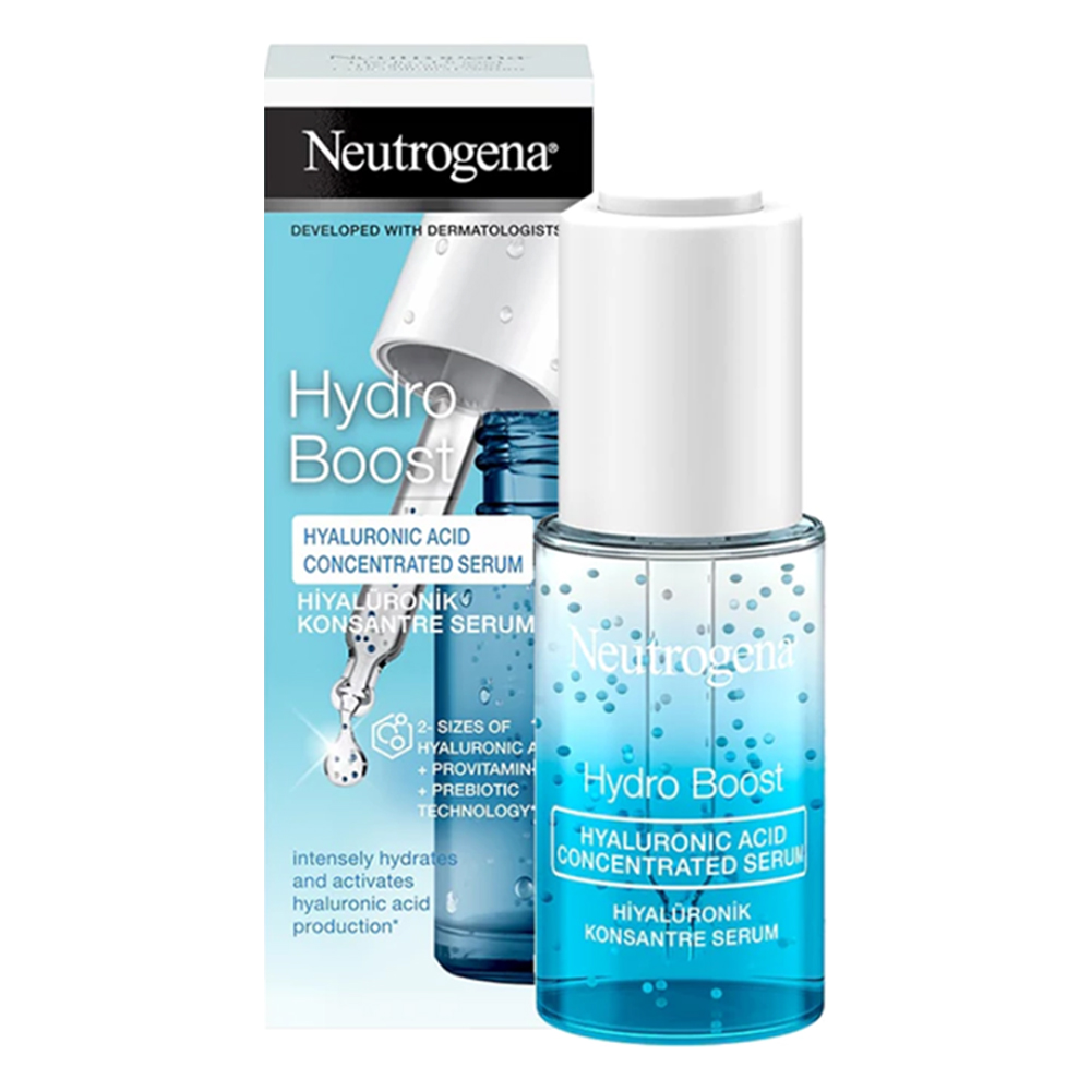 سرم هیالورونیک اسید نوتروژینا مدل هیدرو بوست حاوی بالاترین میزان این اسید در بافت سرمی بسیار سبک و زود جذب می باشد. سرم کنسانتره نوتروژینا غنی از اسید هیاللورونیک در دو سایز و حاوی پرو ویتامین B5 و ترهالوز 100 دردصد طبیعی می باشد. این سرم فاقد بو بوده و علاوه بر آبرسانی عمقی پوست صورت باعث تحریک ساخت اسید هیالورونیک در پوست شده و از اینرو تاثیر ماندگارتری نسبت به سایر آبرسان ها داراست. سرم هیدور بوست نوتروژینا علاوه بر آبرسانی پوست کمک شایانی به حفظ رطوبت و کمک به صافی پوست صورت می کند.