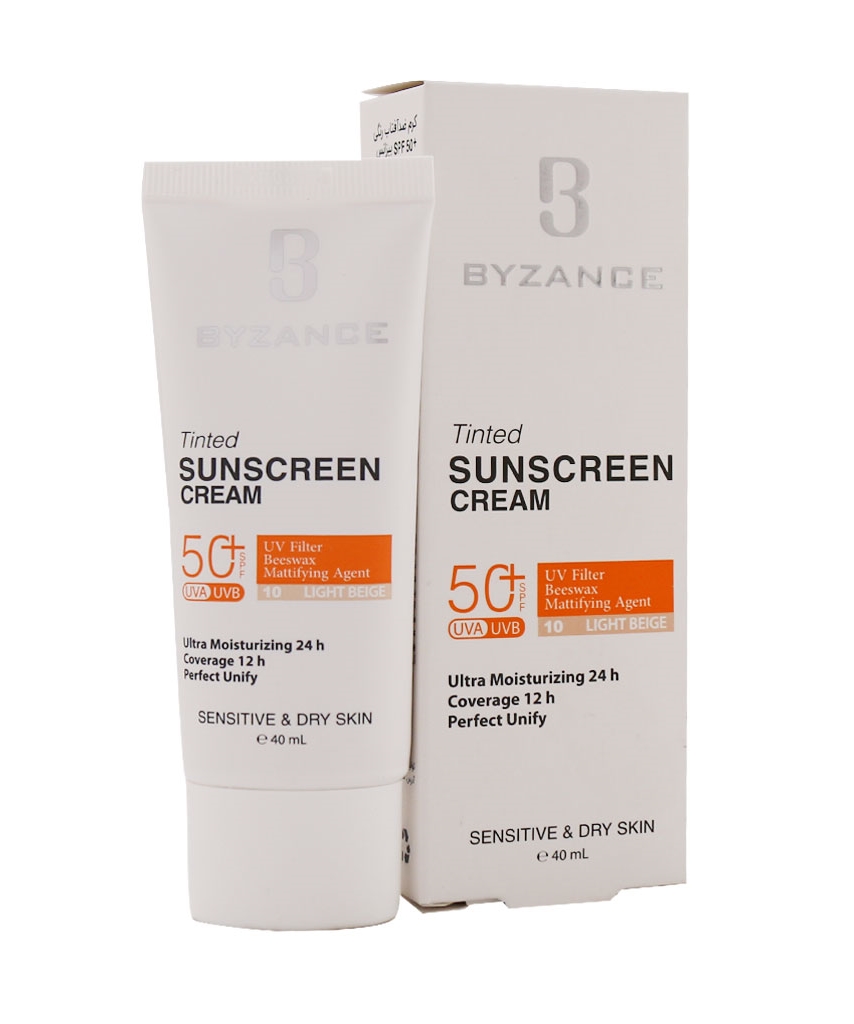 ضد آفتاب بیزانس TINTED SUNSCREEN مخصوص پوست های خشک تهیه گردیده است . این کرم علاوه بر محافظت از پوست درمقابل نور خوشید ، آبرسان و صاف و یکدست کننده پوست نیز میباشد . به دلیل بافت سبک کرم به راحتی روی پوست پخش می گردد و تا 12 ساعت بصورت مات روی صورت باقی میماند . بهتر است 30 دقیقه قبل از قرار گیری در معرض آفتاب از این کرم استفاده شود