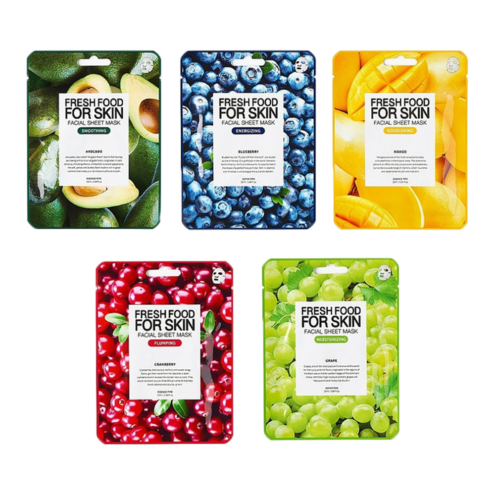 پک صاف کننده پوست صورت مناسب انواع پوست حاوی 5 ورقه ماسک شامل ماسک آووکادو، بلوبری، انبه، زغال اخته، انگور