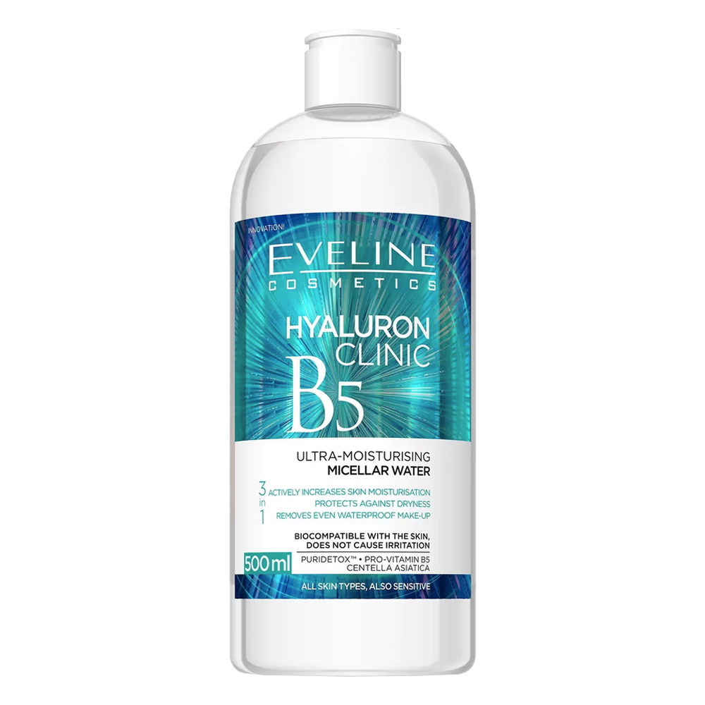 میسلار واتر پاک کننده آرایش و آبرسان اولاین هیالورون Eveline Hyaluron B5 دارای فرمول نوآورانه و جدید برای رطوبت رسانی و پاک کنندگی همزمان انواع آرایش از جمله آرایش ضدآب به همراه مواد موثر تسکین بخش و احیا کننده پوست می باشد. میسلار واتر اولاین حاوی آخرین نسل هیالورونیک اسید برای آبرسانی عمیق پوست، پرو ویتامین B5 برای بازسازی و محافظت اپیدرم در برابر از دست دادن رطوبت، عصاره گیاه سیکا (سنتلا آسیاتیکا) برای ترمیم و بازسازی پوست و روغن زیتون برای تغذیه و لطافت پوست می باشد. این فرمول همچنین حاوی کمپلکس سم زدای PURIDETOX برای تصفیه و پاکسازی آلودگی های محیطی و محافظت از سد دفاعی طبیعی پوست است، در نتیجه پوستی تمیز، رطوبت رسانی شده و محافظت شده خواهیم داشت.