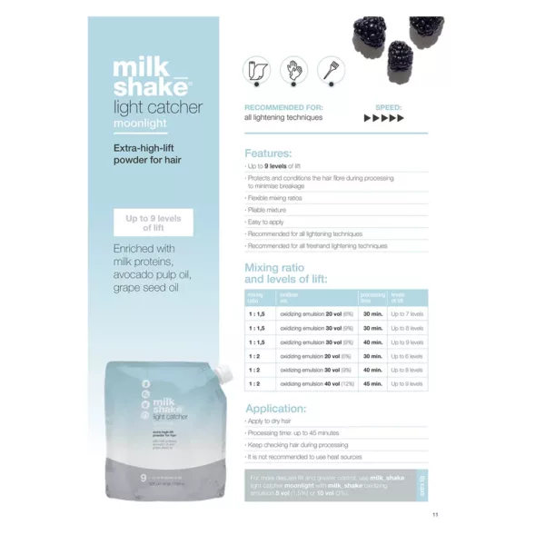 این پودر توانایی روشن‌کنندگی تا ۹ درجه (در شرایط استاندارد و پایه‌ی روشن) را دارد و برای استفاده بر روی پایه‌های طبیعی تا تیره نیز قابل استفاده است، بدون ایجاد افت زیادی در درخشندگی. Milk Shake Moon Light نمونه‌ای از نگاه علمی + شیمی سبز است: بدون پارافین، سیلیکون و آمونیاک افراطی. استفاده‌ی مداوم از آن حتی در موهای آسیب‌دیده احیاء بافت را به دنبال دارد، به‌ویژه اگر پس از آن از ماسک پروتئینی Milk Shake Integrity Bonding استفاده شود.