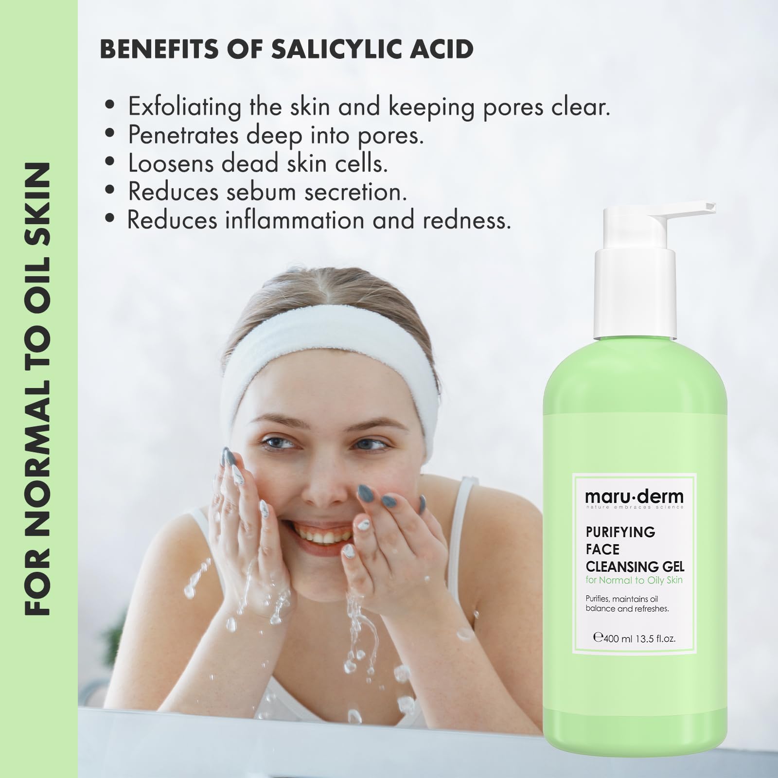 ژل پاک کننده مارودرم purifying face cleansing gel ژل پاک کننده صورت سالیسیلیک اسید مارودرم maru derm purifying face cleasing gel for normal to oily skin از قدرت پاک کنندگی بسیار بالایی برخودار است و تمامی آلاینده های روزمره اعم از محصولات آرایشی، چربی های اضافی، سموم ناشی از تعریق و … را از روی پوست حذف می کند. ژل شستشوی صورت مارودرم پوست چرب علاوه بر قدرت پاک کنندگی برخلاف محصولات مشابه به راحتی از روی پوست شسته می شود. همچنین این محصول منافذ پوست را نیز تمیز می کند.