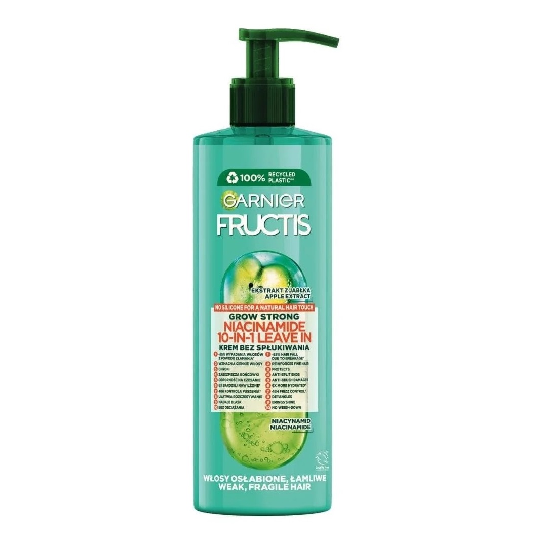 کرم مو 10کاره گارنیه Garnier Fructis Grow Strong Niacinamide 10 in 1 یک فرمول چندمنظوره و نوآورانه است که بهطور خاص برای موهای ضعیف، نازک و مستعد ریزش ساخته شده است. این محصول با ترکیبی قدرتمند از نیاسینامید (ویتامین B3)، کراتین گیاهی، ویتامین B6 و عصارههای میوهای غنی، علاوه بر تغذیه عمیق فیبر مو، آن را از ریشه تا نوک تقویت کرده و به رشد سالم و مقاوم کمک میکند.